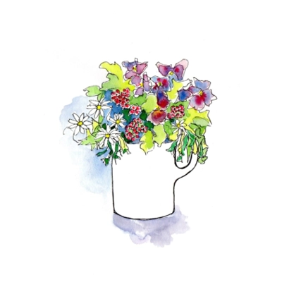 Notelet Card with a print of an original Pen & wash painting of a vase of mixed flowers: Daisies, Verbena & petunias. The card is blank inside for your own message. A coloured envelope is provided.